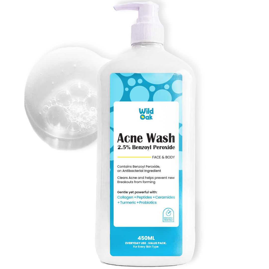 WildOak’s 2.5% Benzoyl Peroxide Face & Body Wash helps reduce acne, bacne, whiteheads, clogged pores, and body breakouts by targeting acne-causing bacteria and deeply cleansing pores.