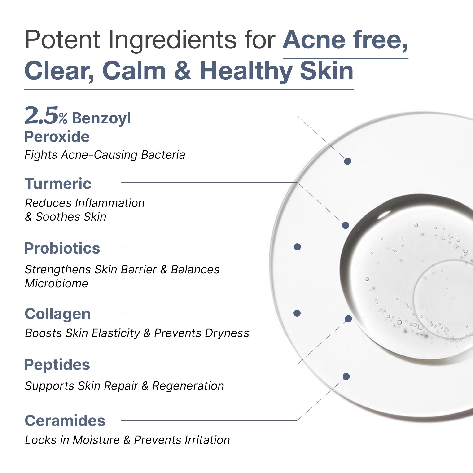 A science-backed blend of 2.5% Benzoyl Peroxide + Niacinamide + Aloe Vera + Glycerin + gentle cleansers for clear, calm, non-drying acne care on face & body.