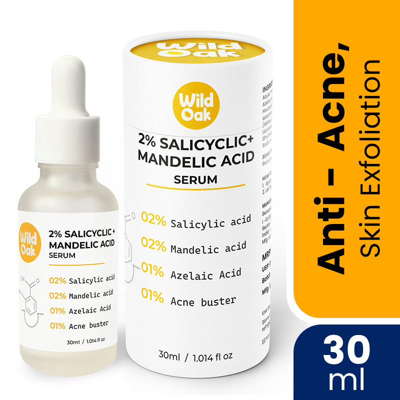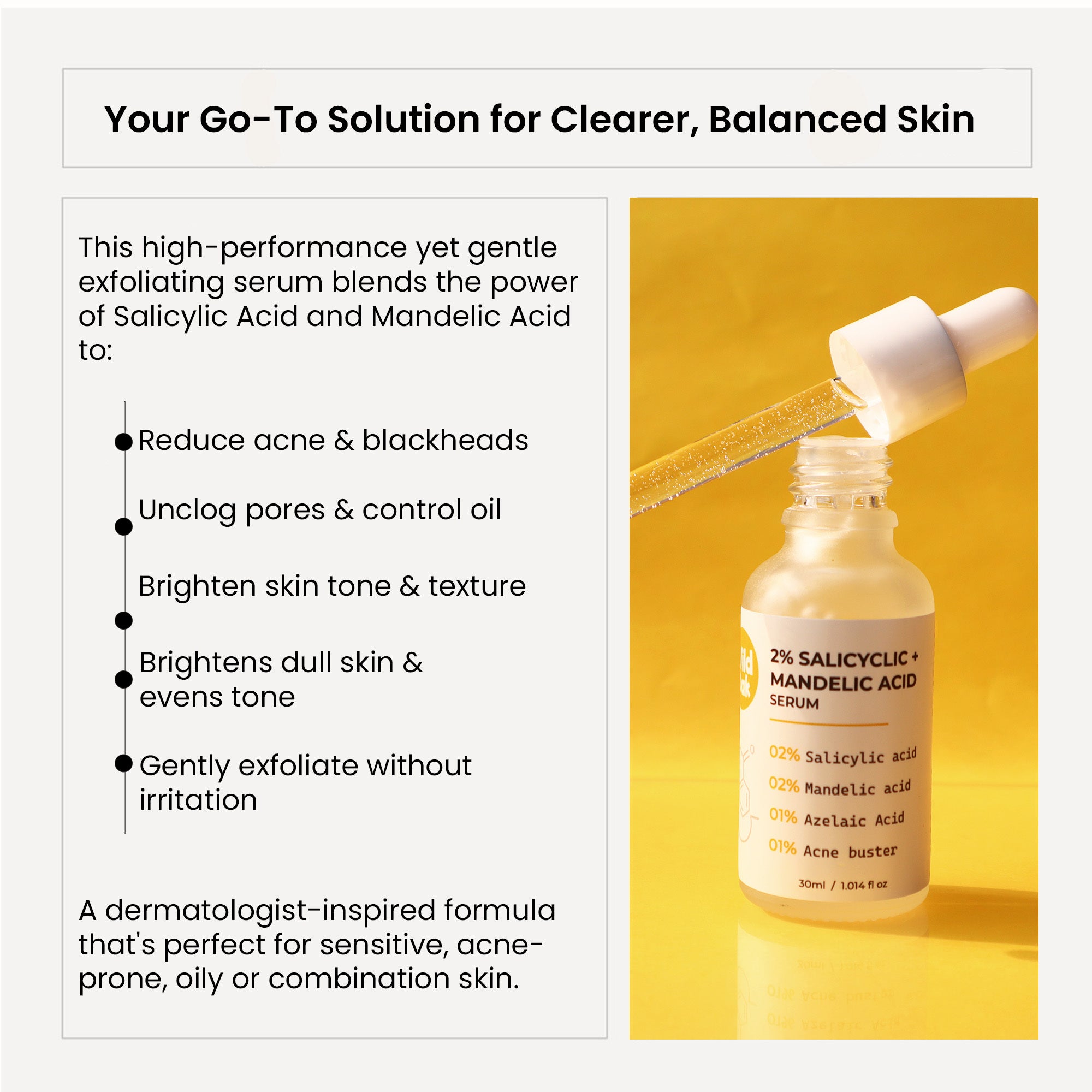 This 2% Salicylic + Mandelic Acid Face Serum is packed with:<br> <ul style=style=“list-style-type:circle”> <li><b>2% Salicylic Acid</b></li> <li><b>2% Mandelic Acid</b></li> <li><b>1% Azelaic Acid</b></li> </ul>