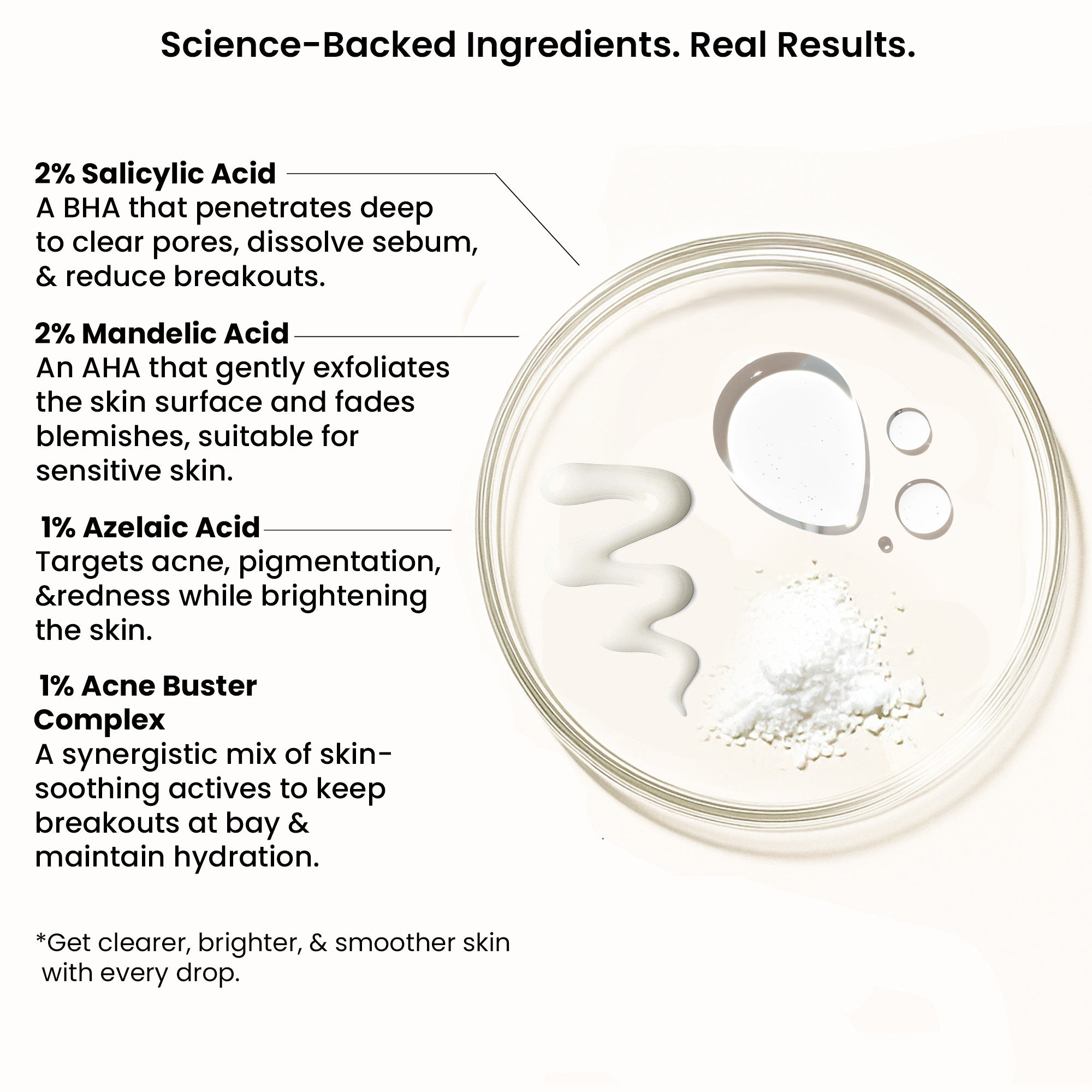 Unlock clear, radiant skin! This powerhouse blend features <b>2% Salicylic Acid to unclog pores and Mandelic Acid for gentle exfoliation</b>. Say goodbye to <b>breakouts</b> and hello to your </b>glow! ✨