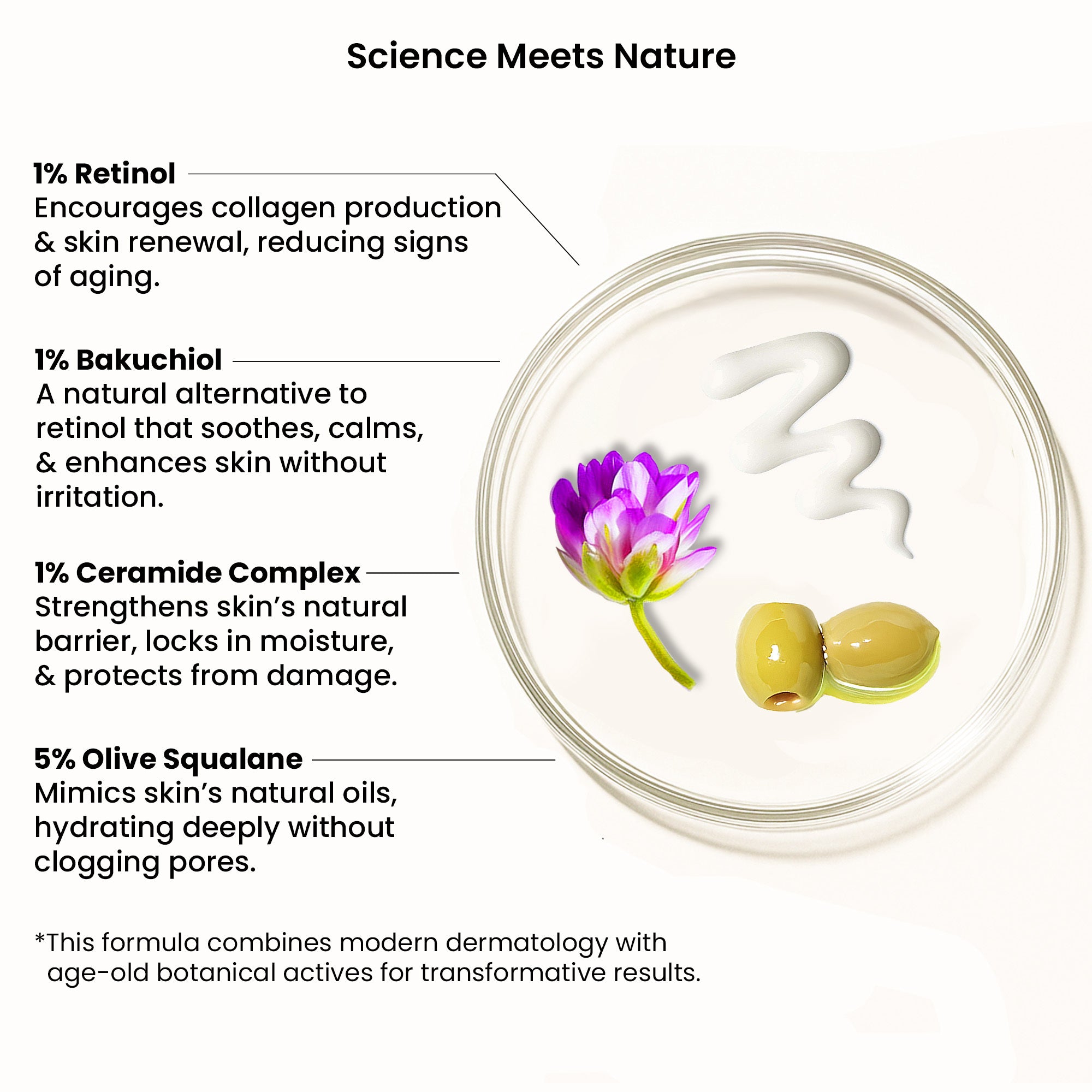 This 1% Retinol Bakuchiol Face Serum is packed with:<br> <ul style=style=“list-style-type:circle”> <li><b>5% Olive Squalane</b></li> <li><b>2% Kojic Dipalmitate</b></li> <li><b>1% Centalla Extract</b></li> <li><b>1% Licorice Extract</b></li> </ul>