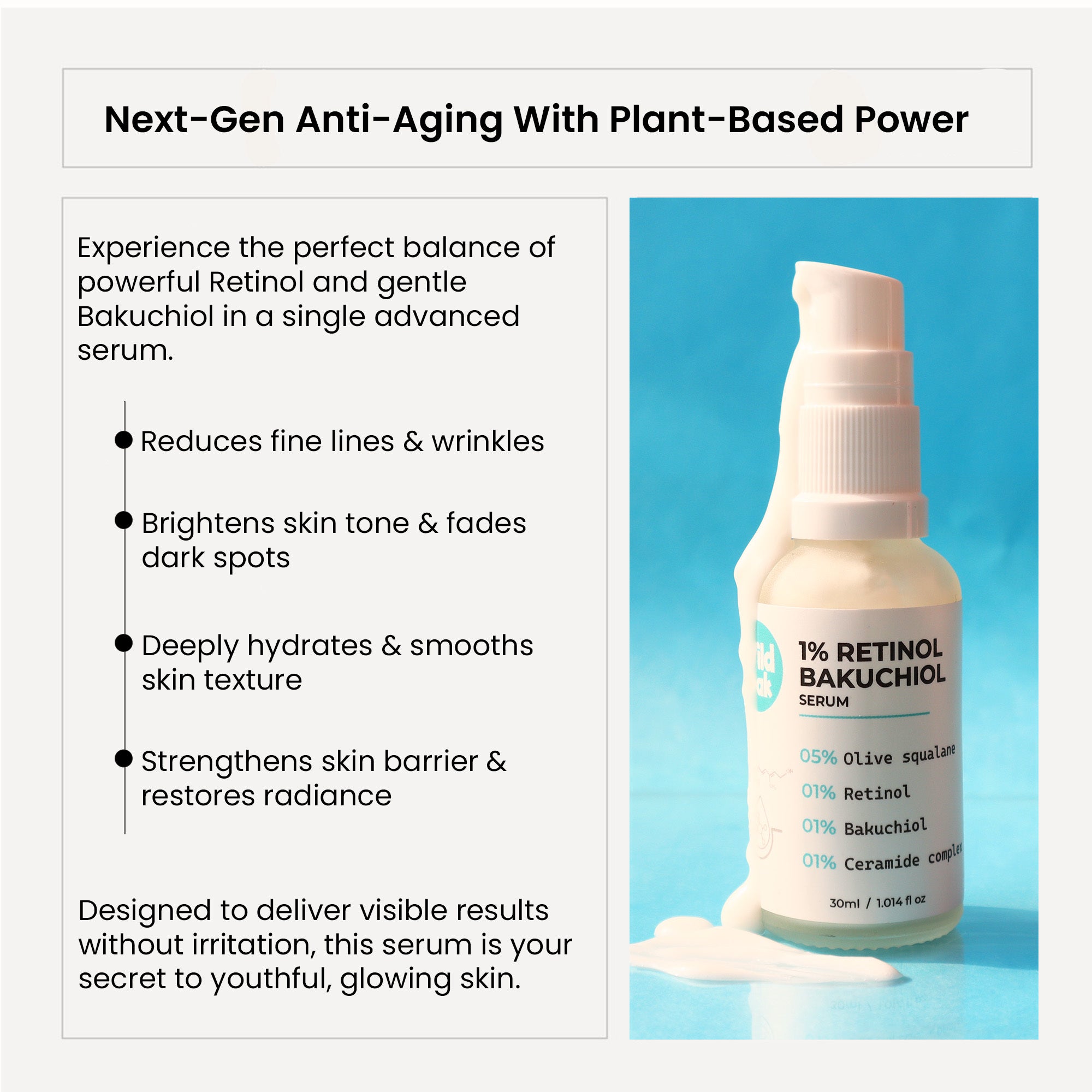 Experience the best of both worlds! This unique serum combines <b>1% Retinol for powerful anti-aging with Bakuchiol for a gentle touch</b>. Say goodbye to fine lines and hello to <b>youthful, radiant skin</b>—naturally! Perfect for all skin types seeking to glow. ✨