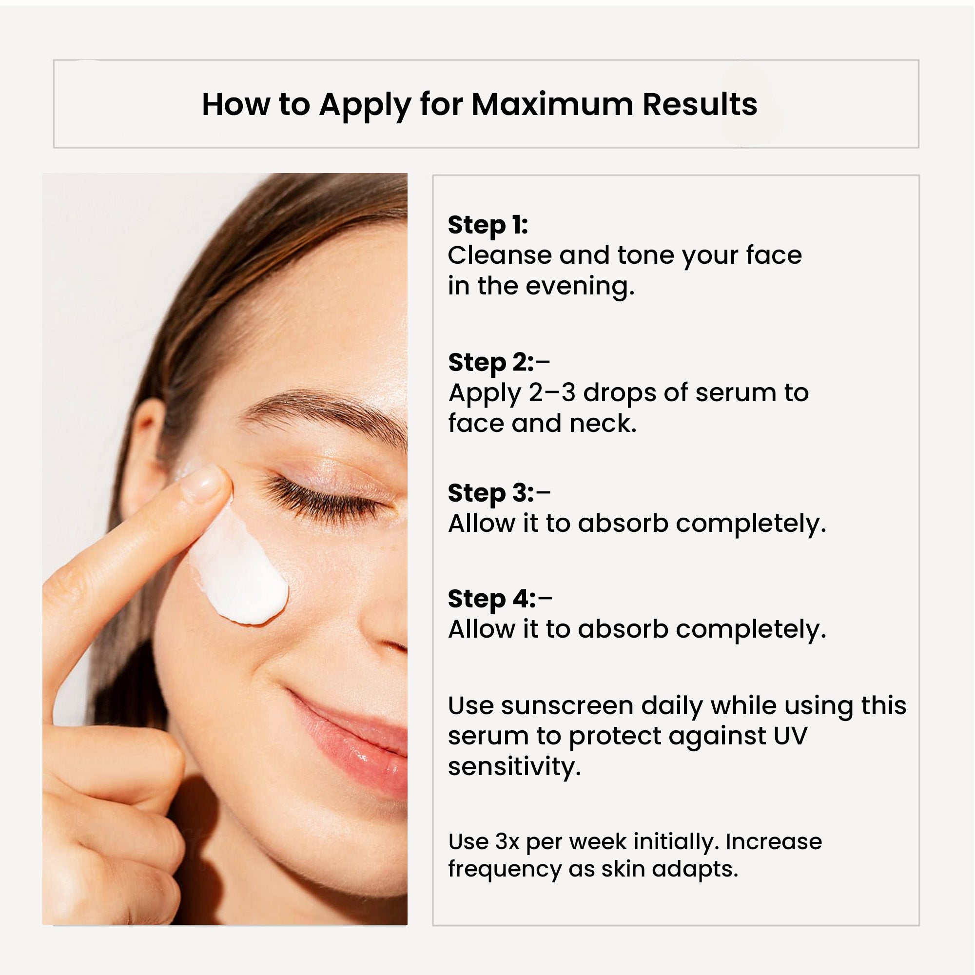 Start by using the serum 2-3 times a week, and gradually increase to nightly use as your skin builds tolerance.
